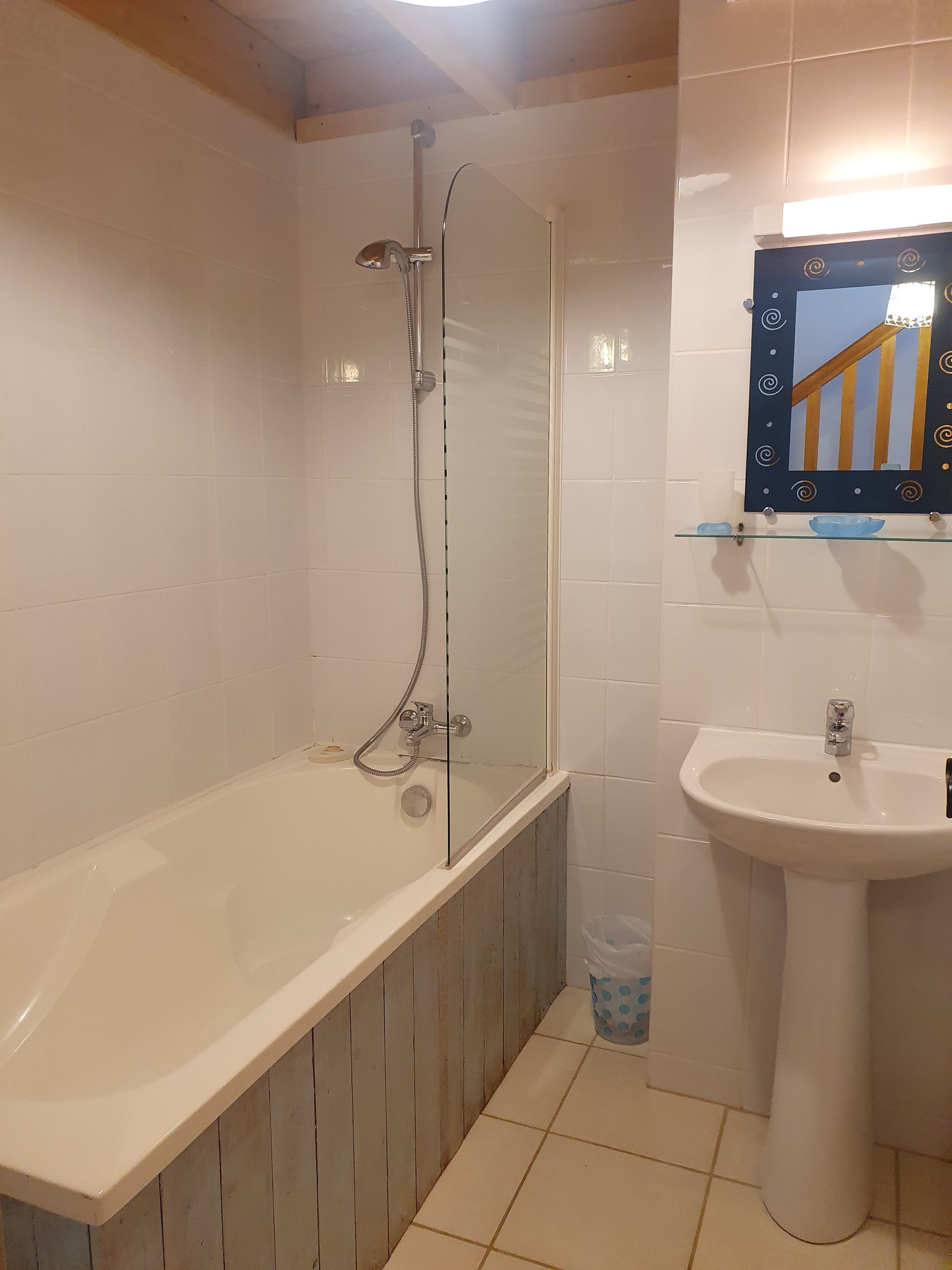 With modern white furniture, a toilet, sink, large bath, and a shower over bath. A baby bath or seat can be supplied if needed.