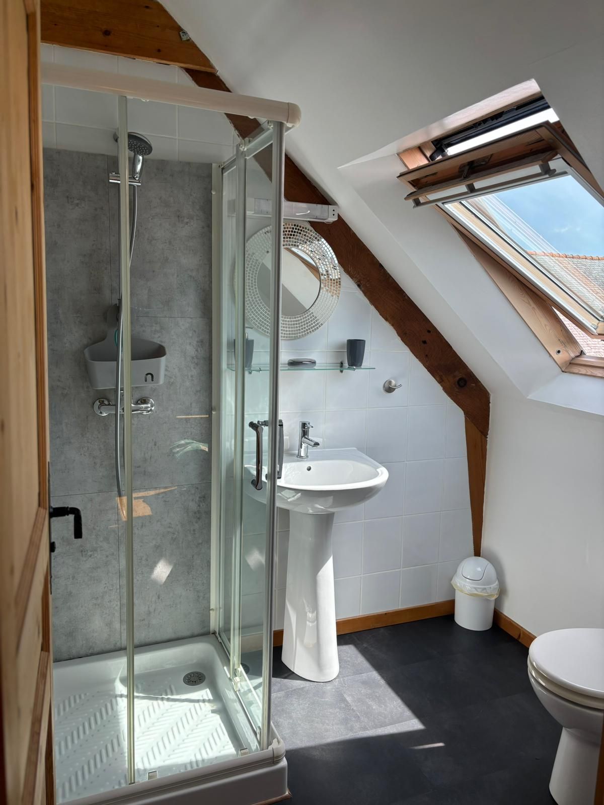 De moderne en-suite badkamer is voorzien van een toilet, een douchecabine, een wastafel en een Velux-raam.